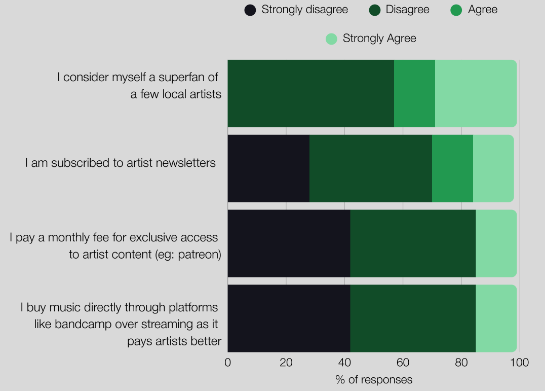 “In the ongoing discourse about superfans in the music industry, we decided to dig deeper into their prevalence at the city level. Although 57% of respondents reported that they do not consider themselves superfans, a sizeable 42% agreed or strongly agreed to being superfans of a few local artists. However, this is not supported by common superfan behaviours which we asked about next, such as subscribing to artist newsletters (about 70% of respondents strongly disagree or disagree), paying for exclusive access (85% of respondents do not do this) or buying music directly from the artists rather than streaming (another 85% of respondents do not do this either).”