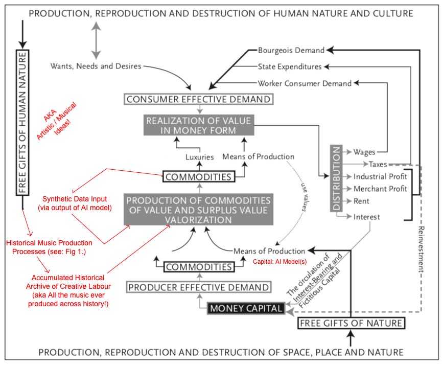 Effectively, through the training process, the accumulated history of creative labour, which is embodied in millions of copyrighted musical works, has been converted into capital, materialized as generative AI models that artists neither own nor control. What once required a steady input of human labour has been absorbed into technological systems capable of endlessly generating new commodities (songs, sounds, and styles!) on demand. This dynamic becomes even more extreme when companies train models on synthetic data — content generated by the model itself — allowing these systems to reproduce and expand without ever returning to living creative labour as a source.
