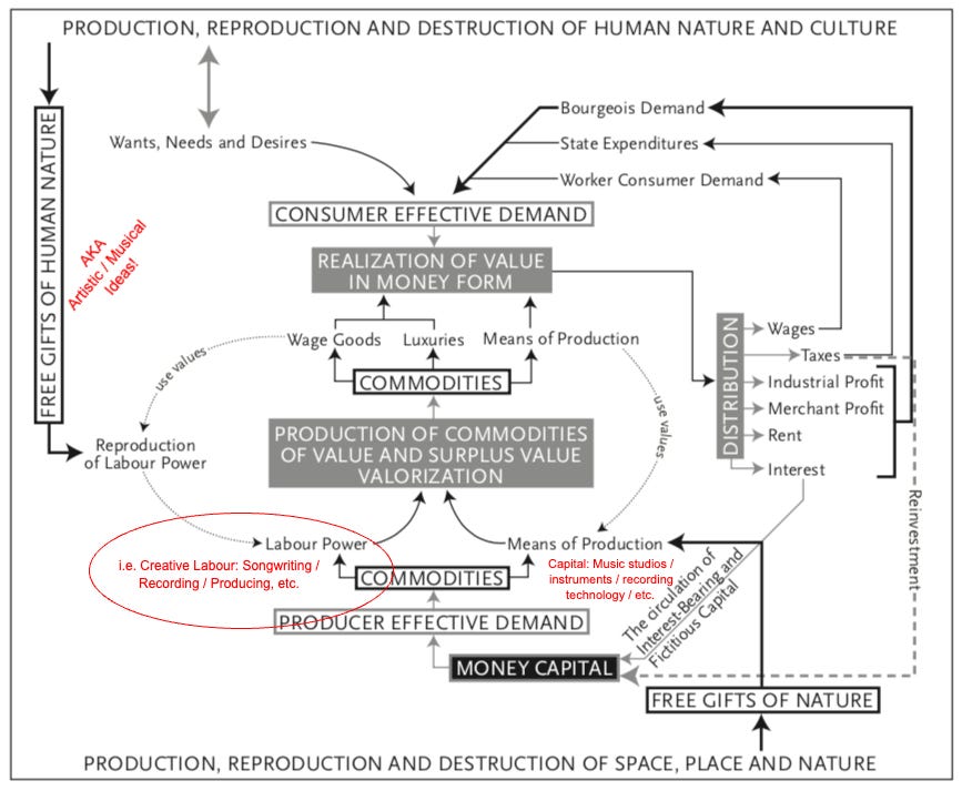 To translate this into music industry terms: artists and creative workers provide the labour that gets turned into a sellable product — the song or album. Songwriters, performers, and recording teams put in the creative work, which is then paired with capital: studios, instruments, and recording technology.7 Once the music is produced, it’s distributed through labels, publishers, distributors, and digital streaming platforms. While artists do receive a share through royalties or rights income, a much larger portion of the value flows upward via those who control the infrastructure.8 This is why debates over streaming payouts and artist compensation are, at their core, debates about who captures the value generated by creative labour.